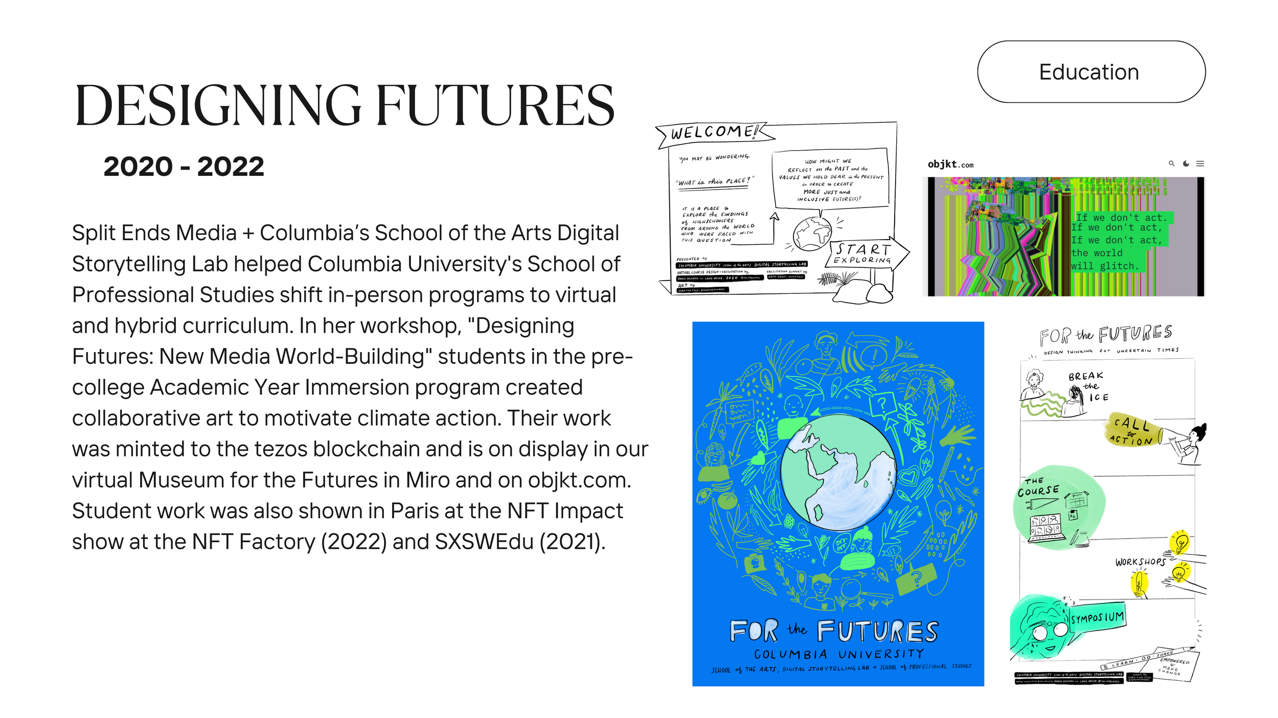 The workshop became very popular over the Summer of 2021, attracting over 200 participating student collaborators. Participants created a community climate statement and art piece that was minted to the Tezos blockchain. Student work went on to be featured at SXSWEdu (2021) and NFT Impact in Paris (2022). The program was also featured in Columbia’s Youth in STEM program (2023).